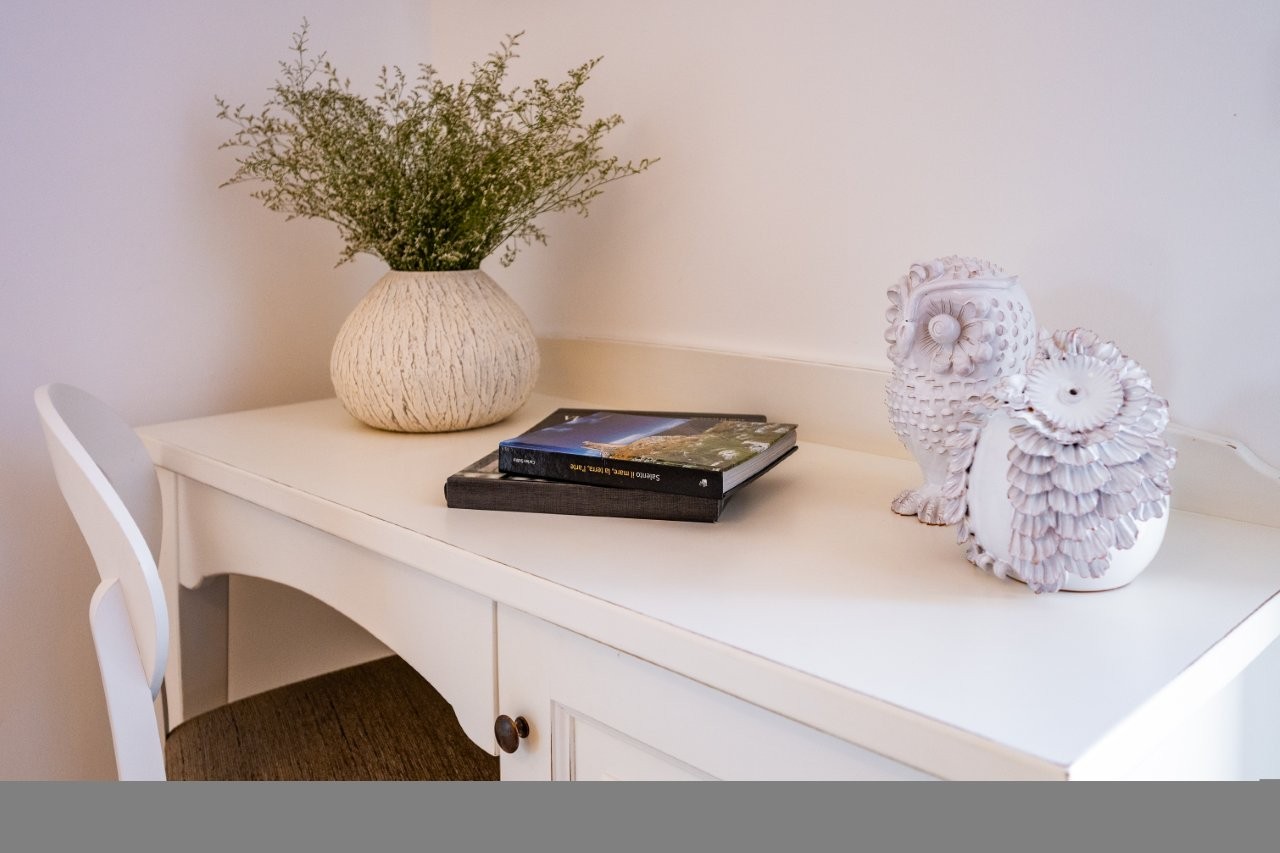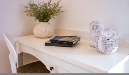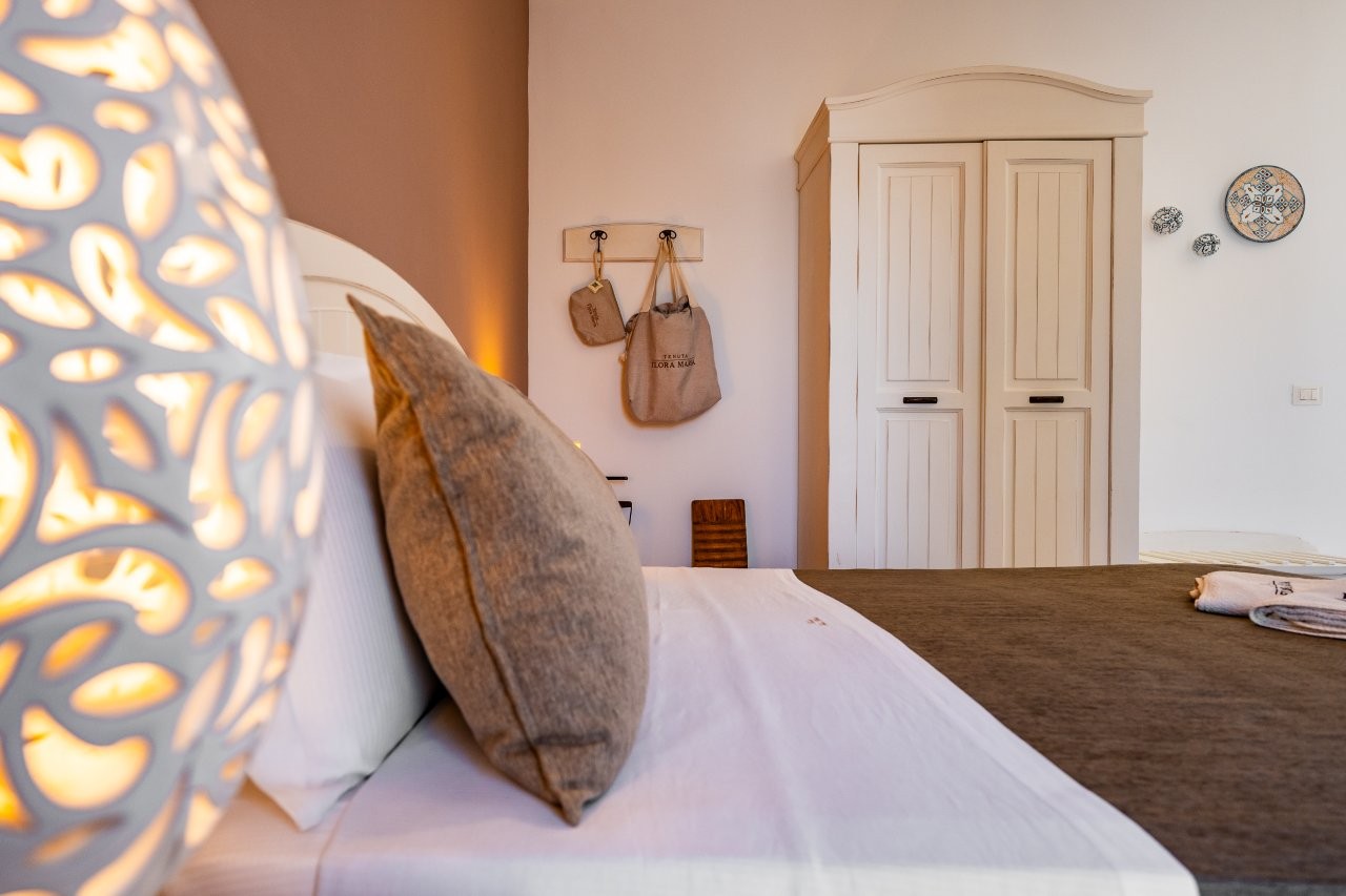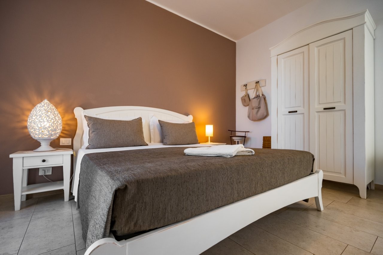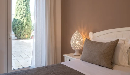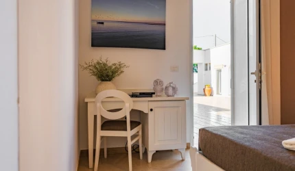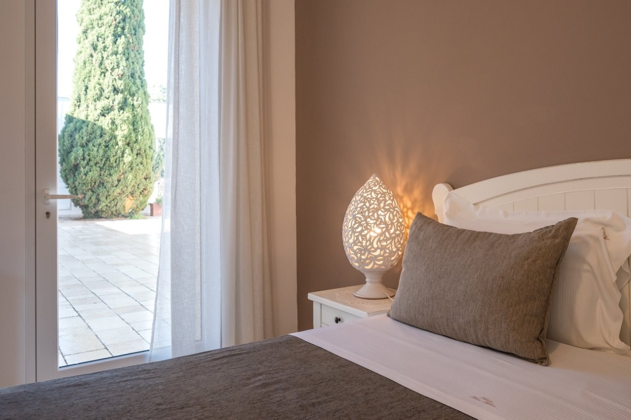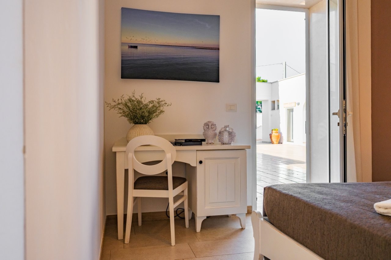 La camera si affaccia sul porticato con uno spazio attrezzato con tavolo e sedie vista giardino e su un'ampia corte attrezzata con divani per rilassarsi, ammirare il cielo stellato delle notti salentine o semplicemente leggere un libro.